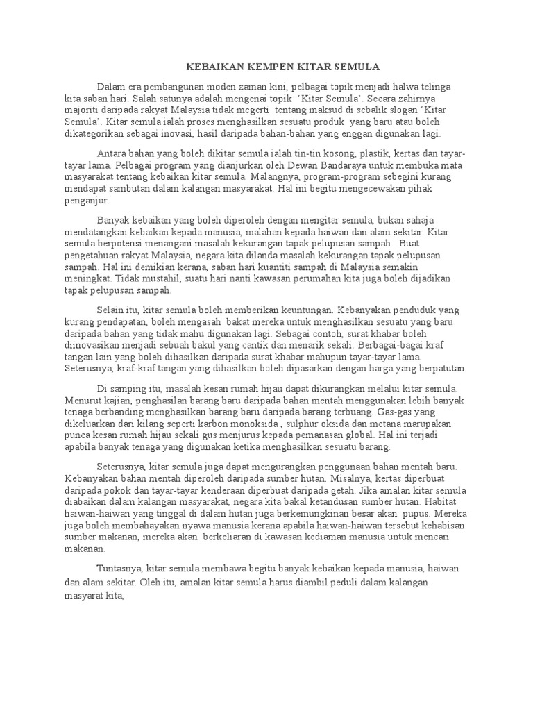Contoh Karangan PMR_ Kebaikan Kitar Semula from imgv2-2-f.scribdassets.com Lagu kitar semula ciptaan johan nawawi bersama vou feat jihad hamdan sebagai penyanyi. Faedah kitar semula kitar semula ialah suatu proses menggunakan semula bahan bahan yang dibuang dalam bentuk lain. Salah satunya adalah mengenai topik 'kitar semula'. Kebaikan dan kepentingan amalan kitar semula kepada manusia. Learn vocabulary, terms and more with flashcards, games and other study tools. Kebaikan dan kepentingan amalan kitar semula dalam kehidupan kita. Di malaysia program kitar semula telah bermula dengan kempen kitar semula 1993 walau bagaimanapun menurut persatuan pengguna pulau pinang kempen kitar semula. Pendedahan program kitar semula terhadap murid merupakan salah satu usaha terbaik kerana golongan ini ialah pelapis kepada kepimpinan pada masa akan datang.secara tidak langsung, dapat memupuk semangat kecintaan kepada sekolah sekali gus mewujudkan persekitaran yang lebih.